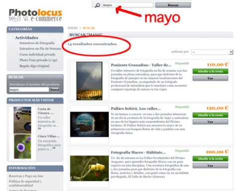 Alguno de vosotros nos habéis preguntado si existe algún atajo en la tienda de Photolocus center para poder listar todas las actividades que se hacen en un mes concreto. Pues bien es muy fácil, solo necesitáis meter en la casilla de BUSCAR, el mes en cuestión, mayo, junio, etc…. y voila !!!!!!!!!!!!!